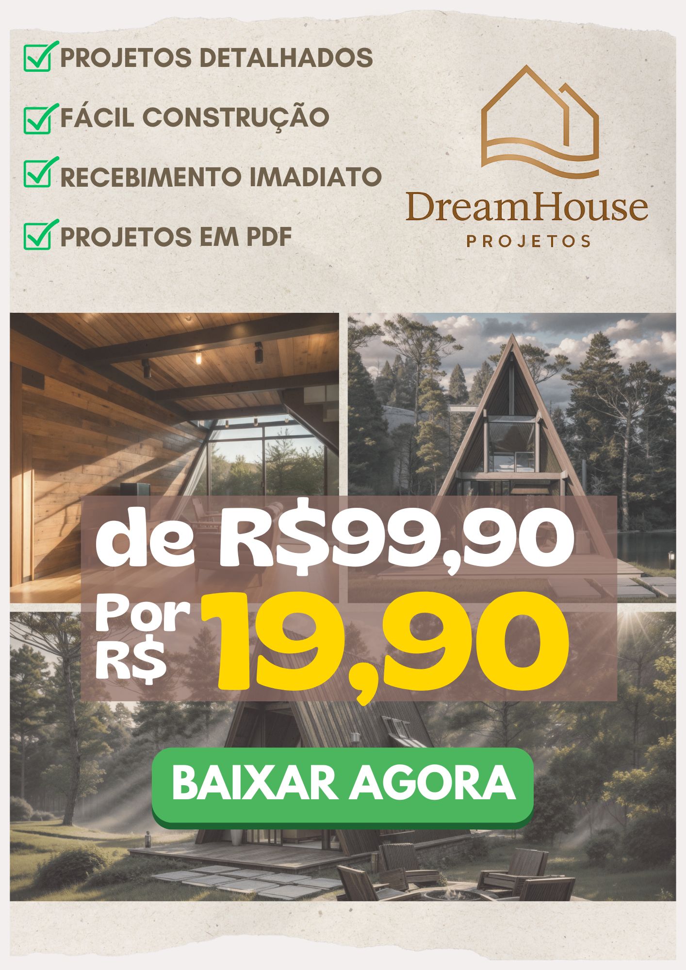 Receba agora 10 projetos completos de casa de campo e cabanas — com plantas, imagens e medidas detalhadas.